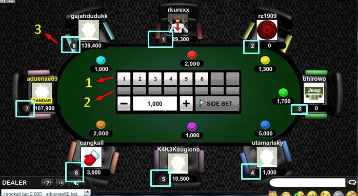 Jika ingin mengadu dengan player lain anda tinggal klik nomer meja yang ingin diadu lalu klik tombol SIDE BET dengan nilai taruhan minimal sesuai dengan limit meja dan kelipatannya.